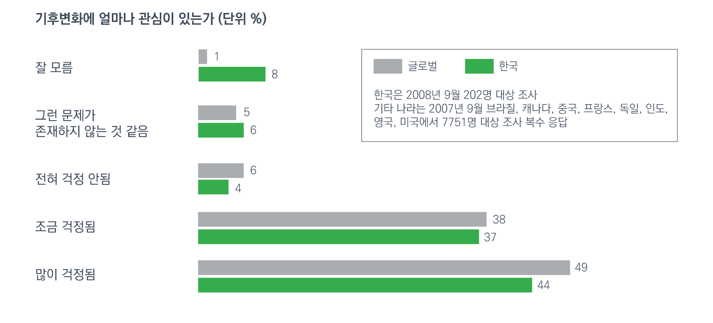 맥킨지가 세계 9개국 8000여명을 대상으로 2007 ~ 2008년에 설문 조사한 결과 한국 소비자의 60%가 최고 우선 순위로 환경 및 기후변화를 꼽았습니다. 독일과 브라질, 미국, 영국, 인도, 중국, 프랑스, 캐나다의 소비자들에게 물었을때도 환경 및 기후변화에 55%의 표가 몰렸습니다.